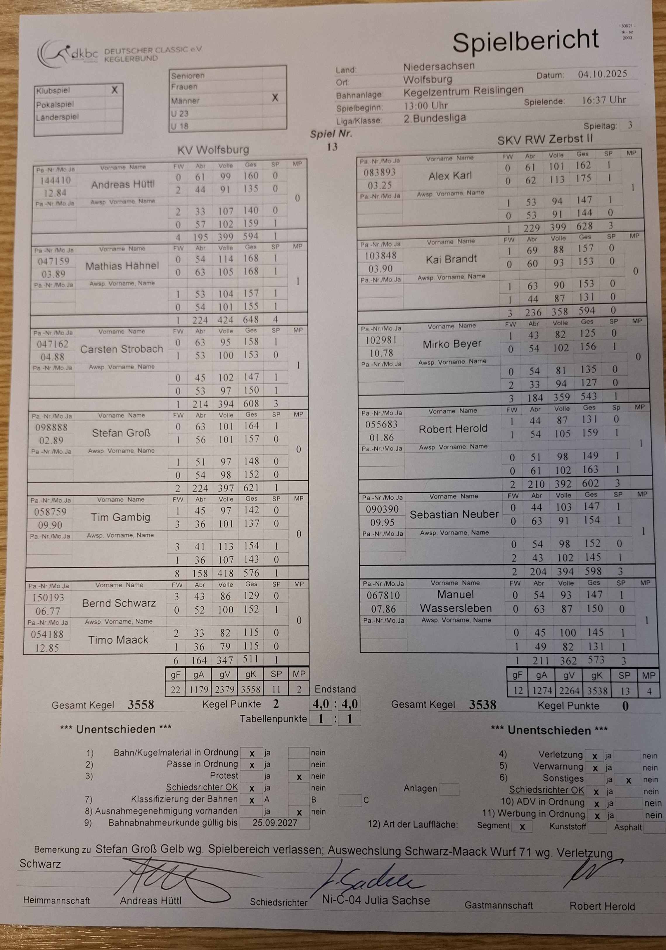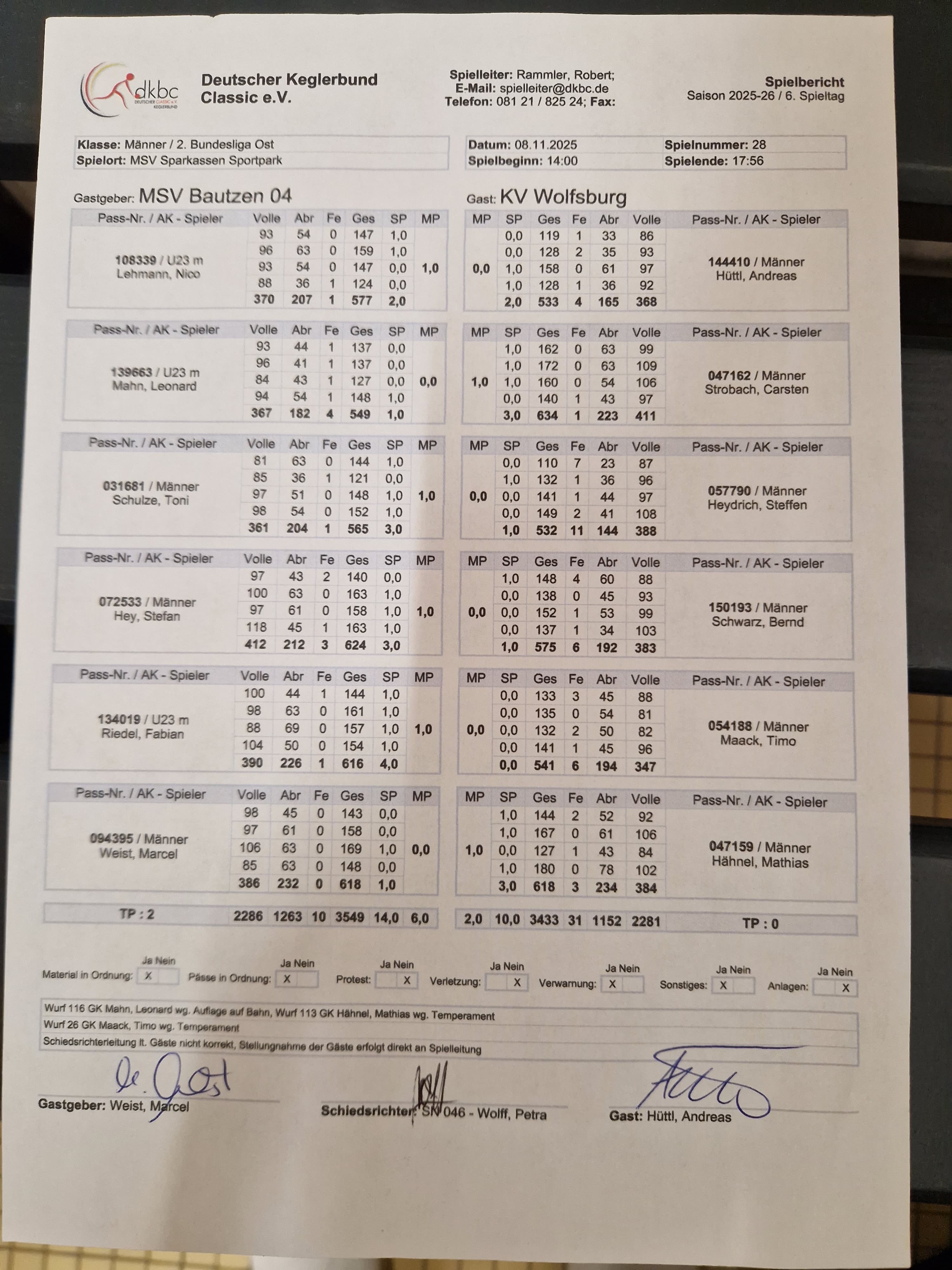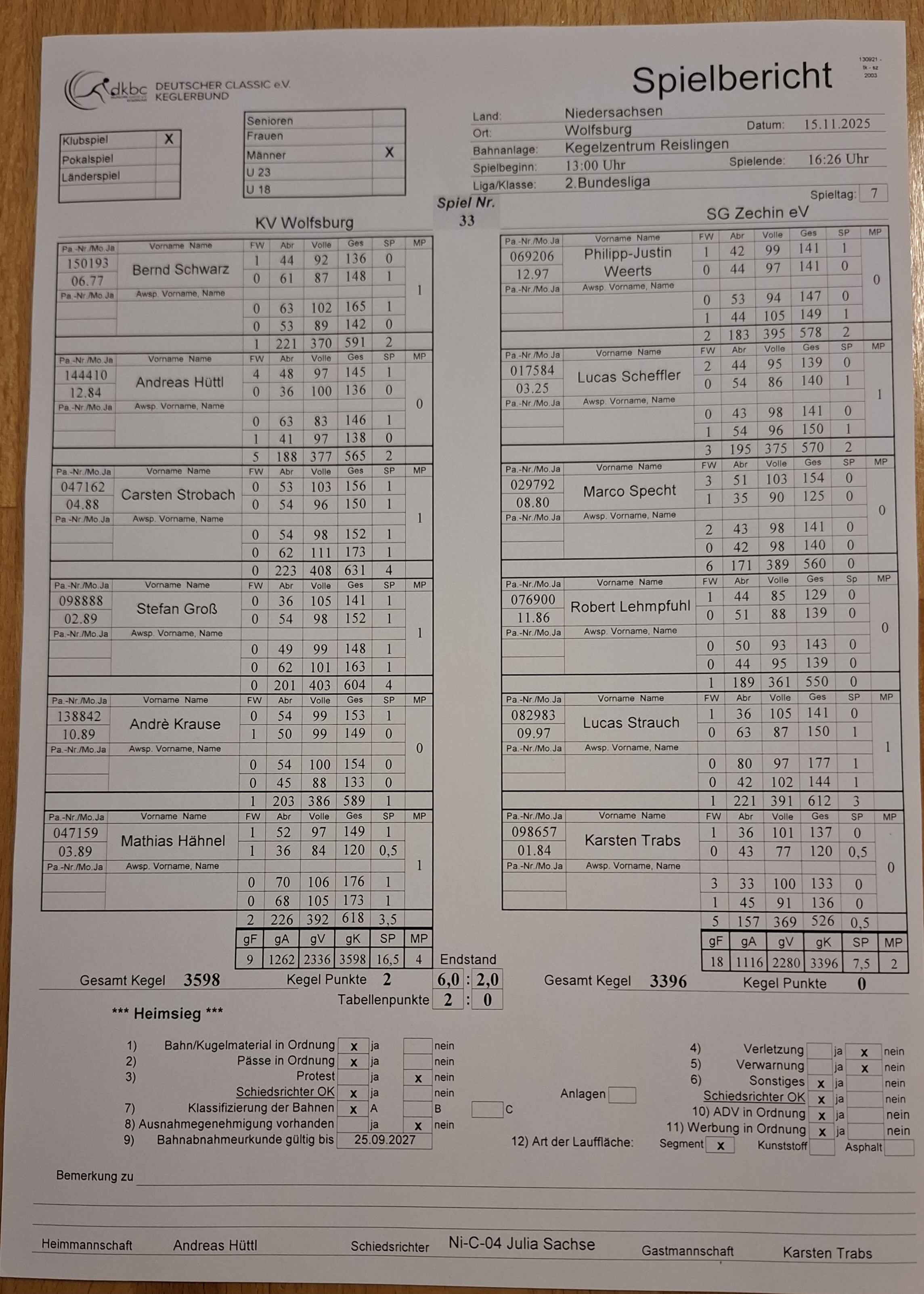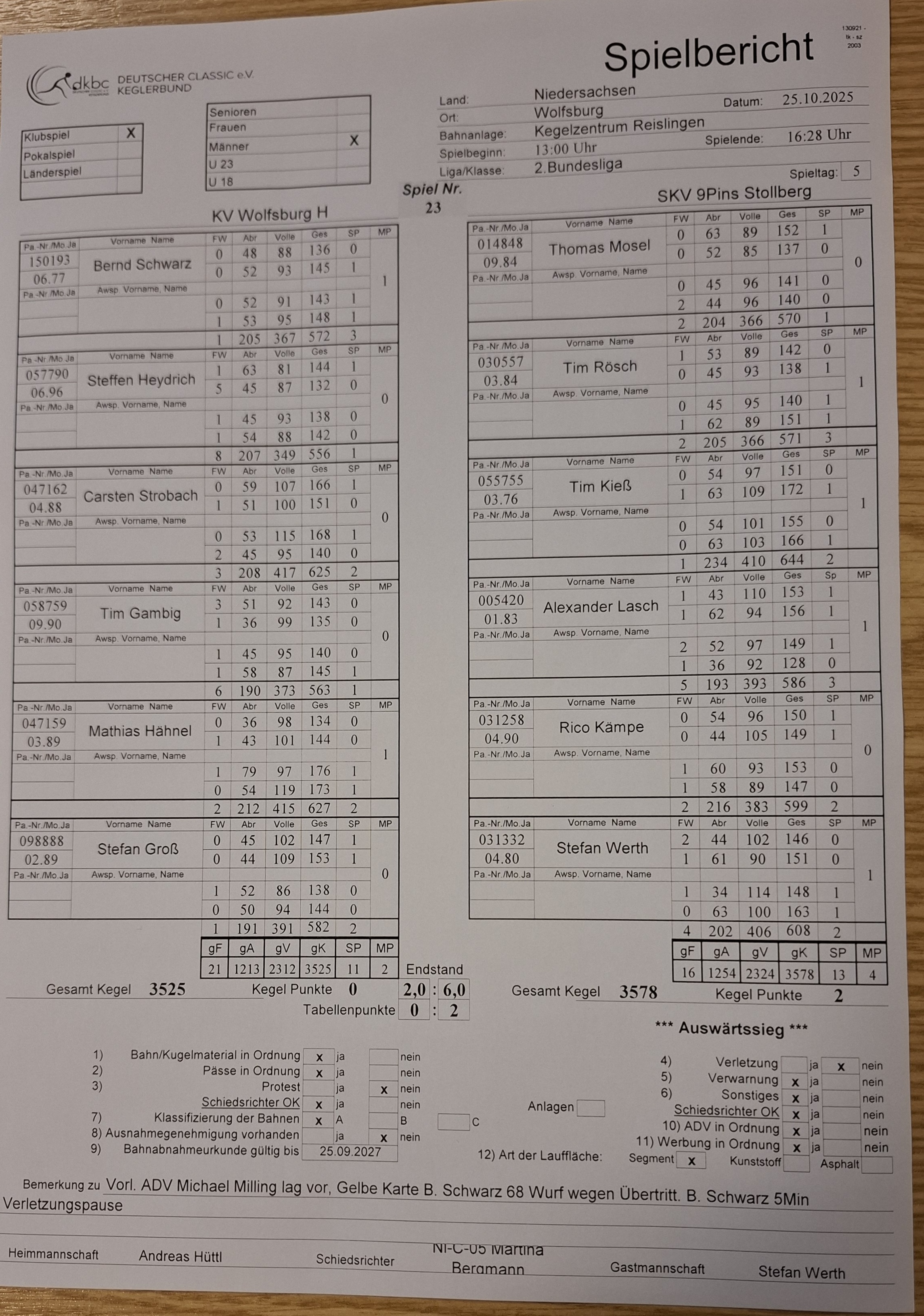 | 25.10.2025 13.00 Uhr | KV Wolfsburg | - | SKV 9Pins Stollberg | 2:6 | S05 | E05 | |
